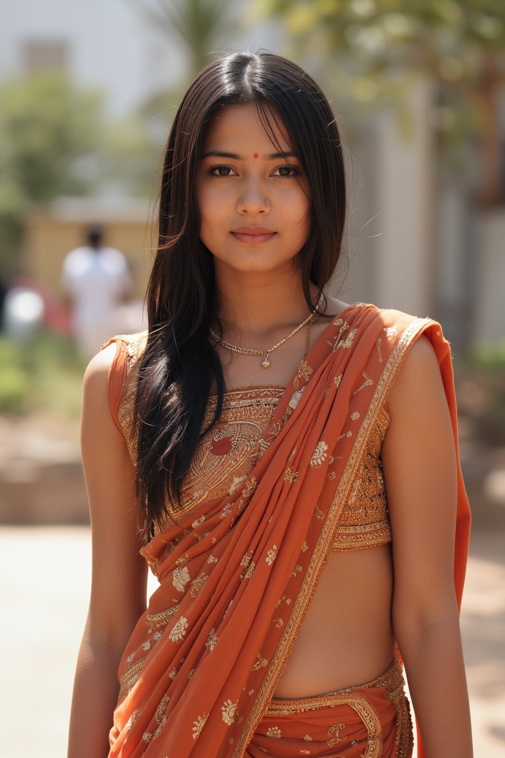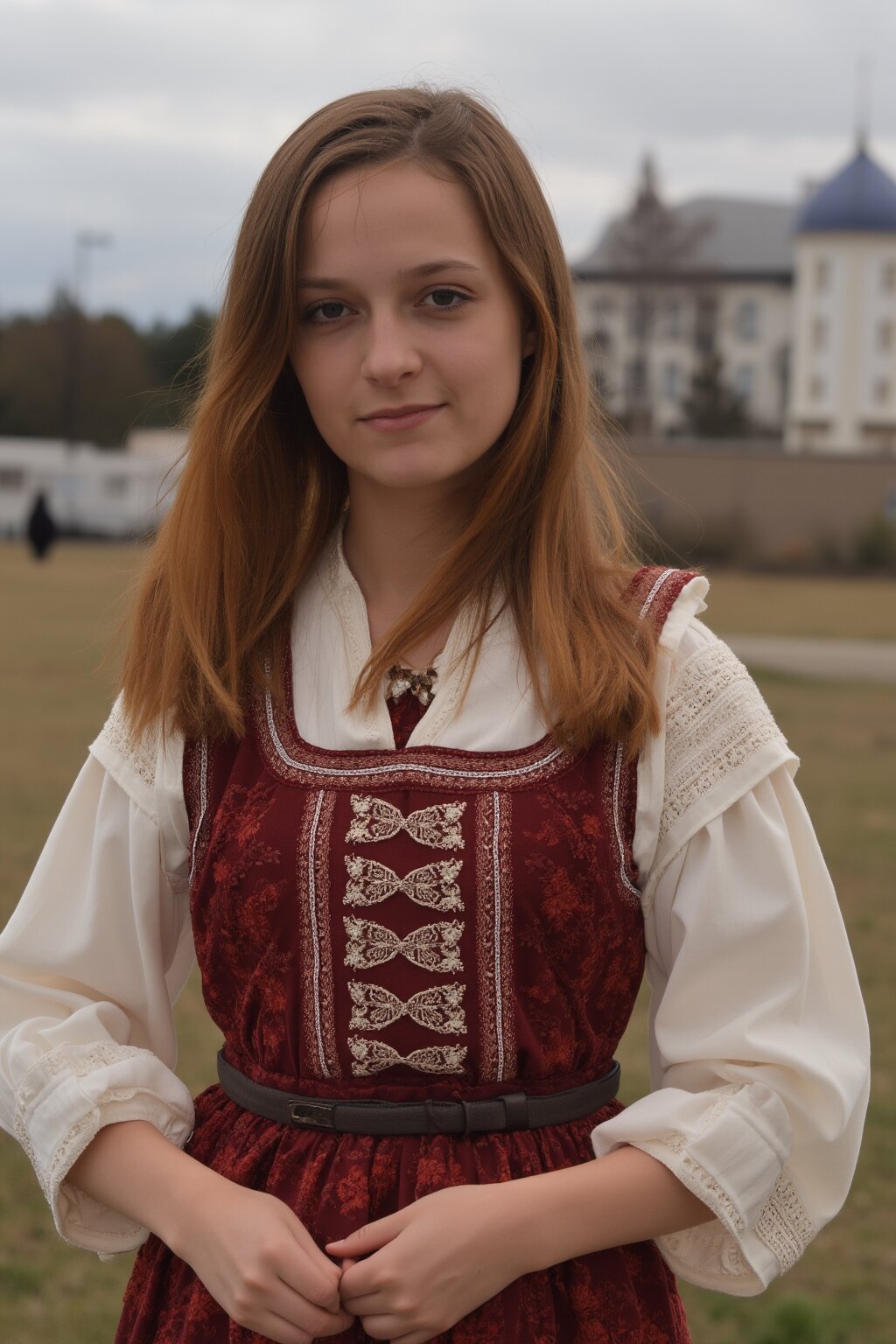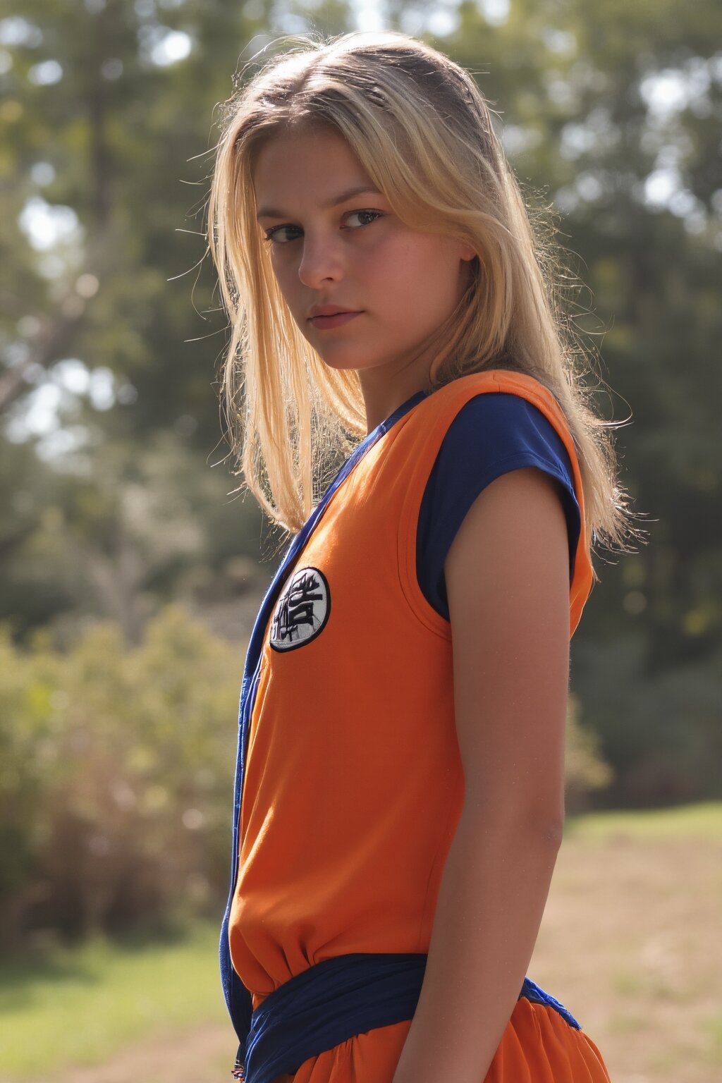 A photograph of a sexy American girl standing outdoors in American attire in an American setting.