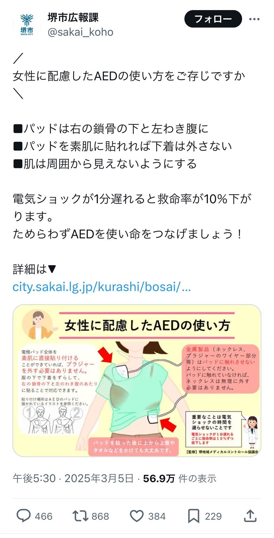 【速報】自治体「AEDは一分遅れると生存率が10%下がるからためらわないで!けどまず女性の配慮忘れないで!」