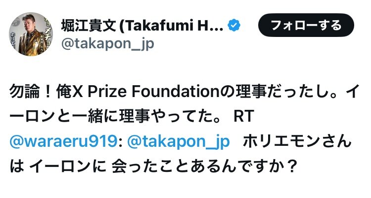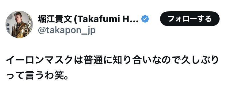 引用元: 堀江貴文「お前バカ?イーロンとは友達だし、新幹線で会ったら、久しぶり!って声かけるわ」