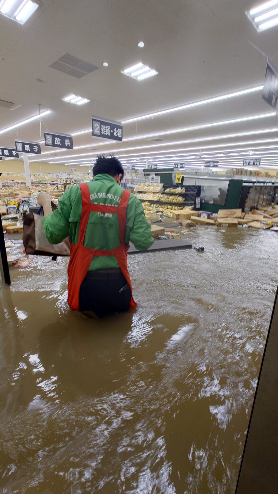 ここまで浸水したら店員に出来ること無いし照明つけてる場合じゃないだろう