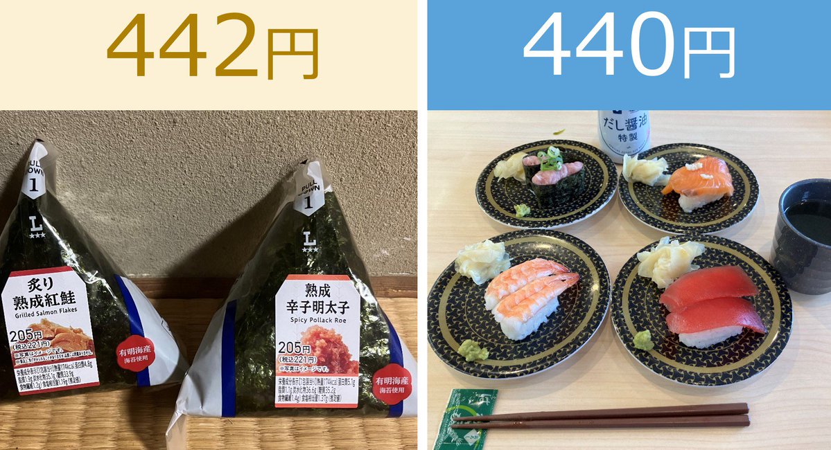 引用元: 【悲報】コンビニおにぎり、値上げした事により回転寿司のコスパに負ける
