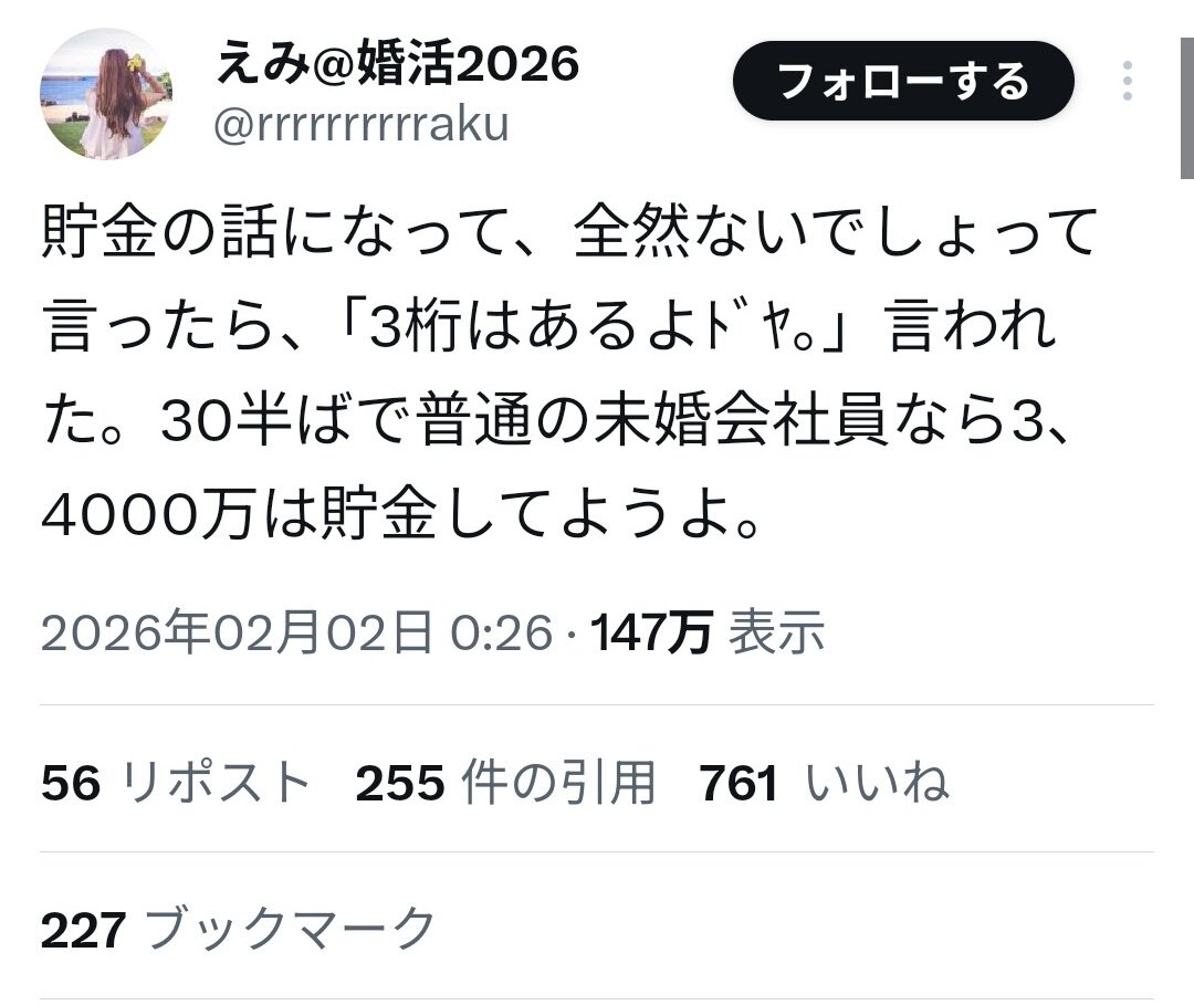 実際これだけ貯金できてるぐらい稼げるのであればとっくに結婚してるだろ