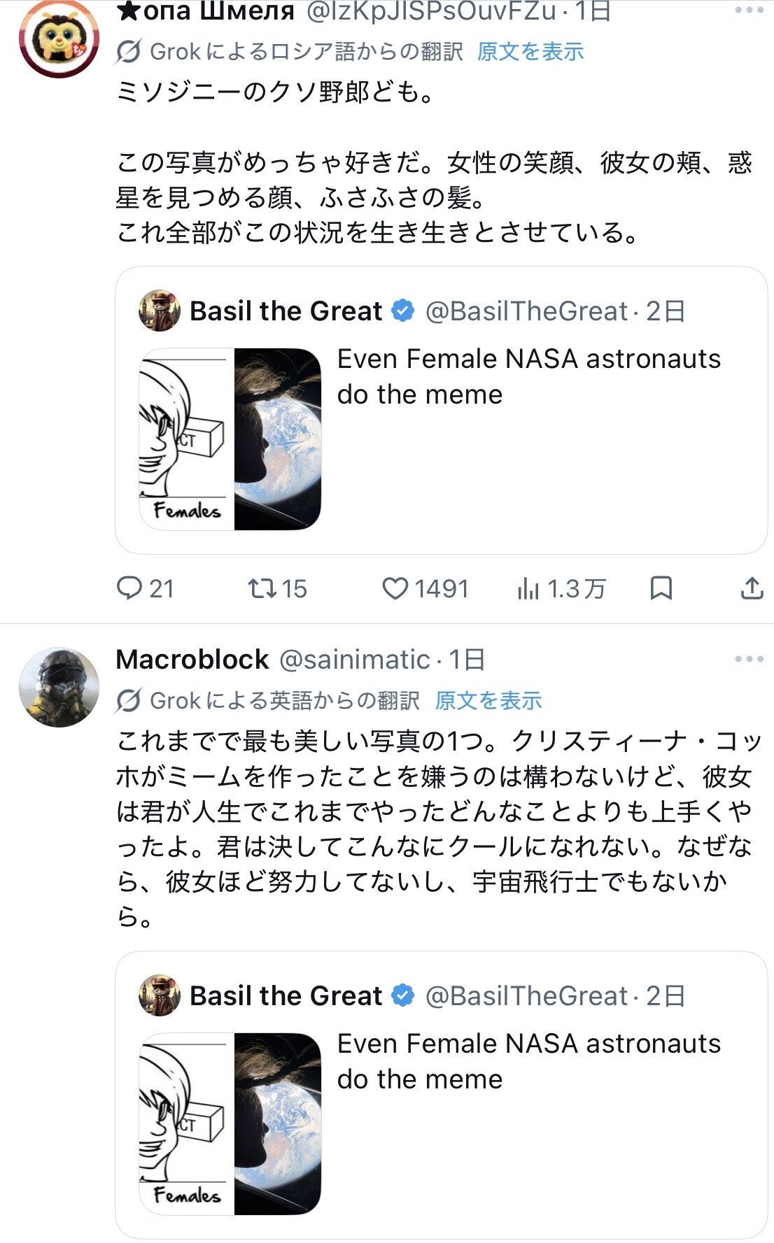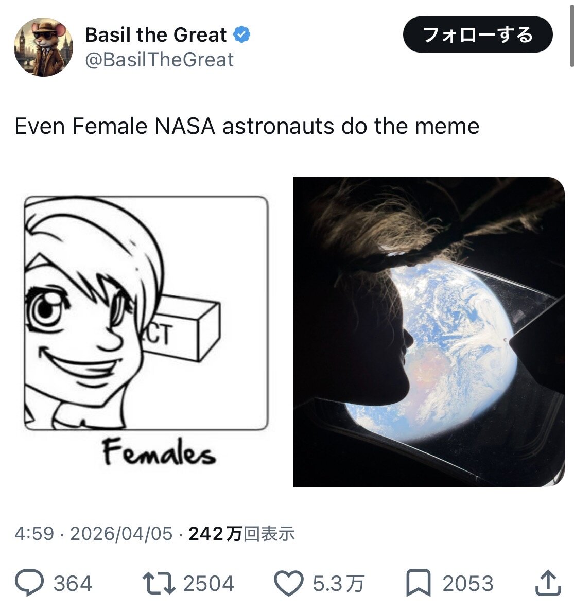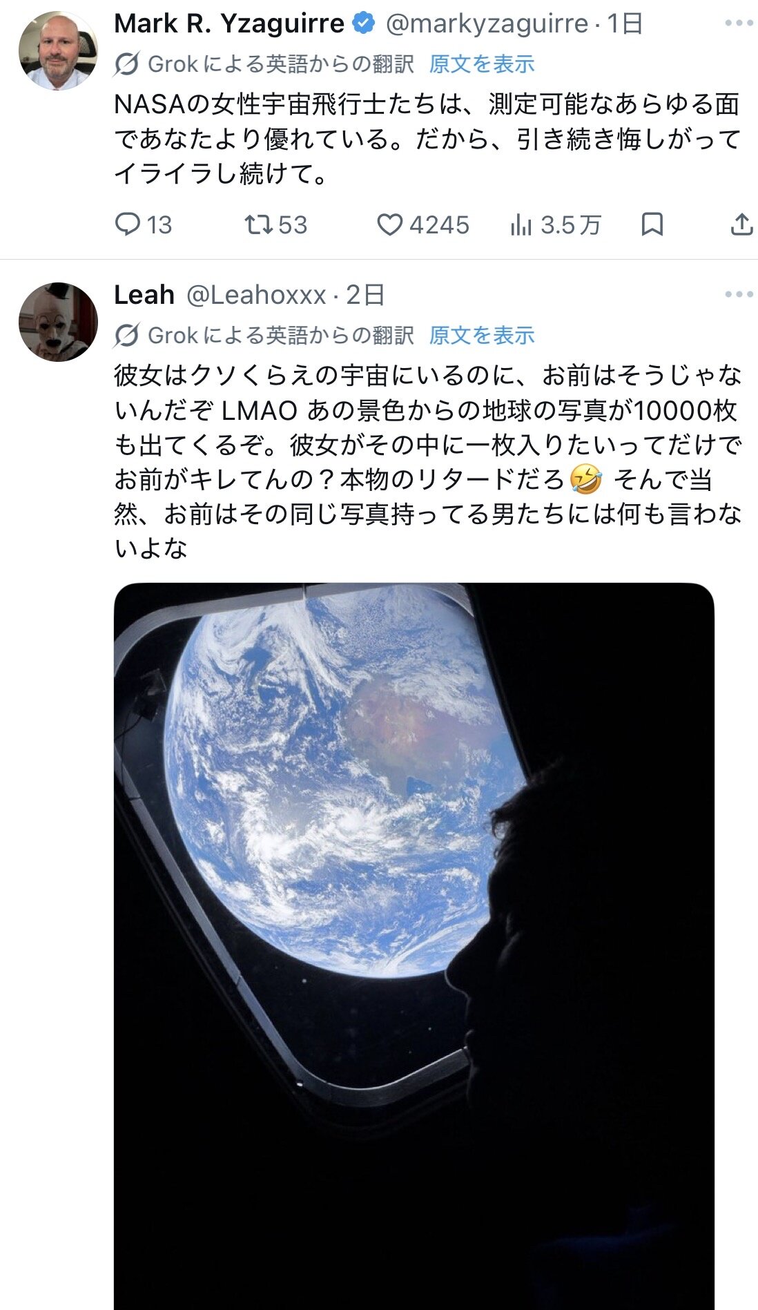 引用元: 【画像】女さん宇宙飛行士さん「宇宙船から地球撮ってみた👩🏽🚀(パシャ」 海外のお前ら「シュババ!!!」